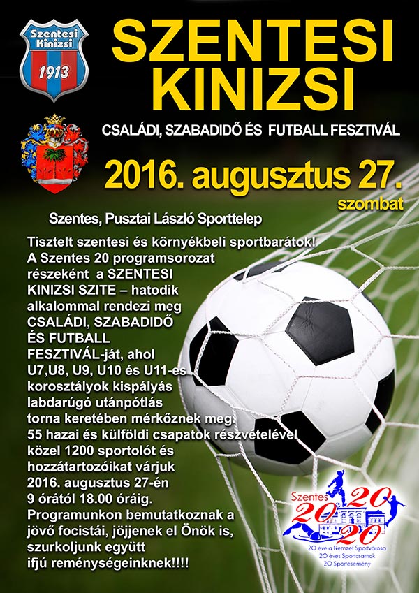 Tisztelt szentesi és környékbeli sportbarátok! A Szentes 20 programsorozat részeként A SZENTESI KINIZSI SZITE – hatodik alkalommal rendezi meg CSALÁDI, SZABADIDŐ ÉS FUTBALL FESZTIVÁL-ját, ahol U7, U8, U9, U10 és U11-es korosztályok kispályás labdarúgó utánpótlás torna keretében mérkőznek meg. 55 hazai és külföldi csapatok részvételével közel 1200 sportolót és hozzátartozóikat várjuk 2016. augusztus 27-én 09 órától 18.00 óráig. Programunkon bemutatkoznak a jövő focistái, jöjjenek el Önök is, szurkoljunk együtt ifjú reménységeinknek!!!!