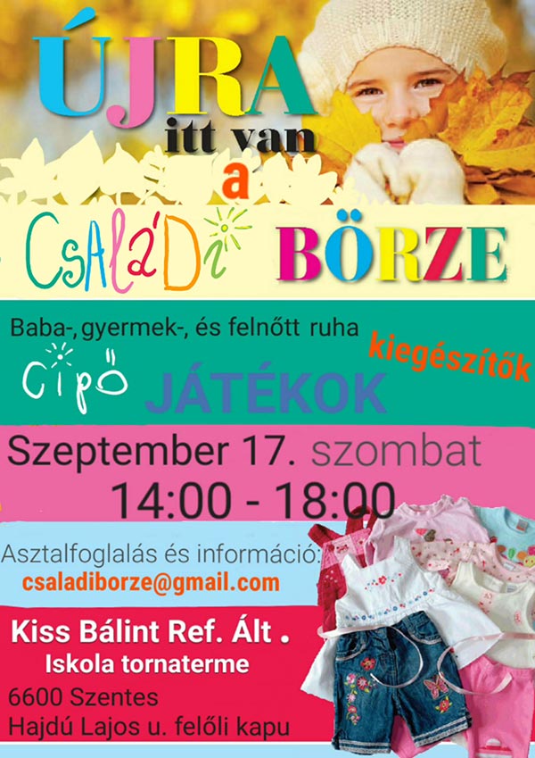 Újra családi börzére várják az érdeklődőket 2016. szeptember 17-én szombaton 14 és 18 óra között a Kiss Bálint Református Ált. Iskola tornatermében.
