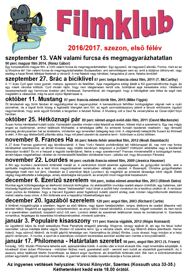 Szeptember 13-án indul a Városi Filmklub 2016/2017-es szezonja. A Városi Könyvtárban kéthetente kedden rendezett ingyenes vetítésekre várnak minden érdeklődőt!