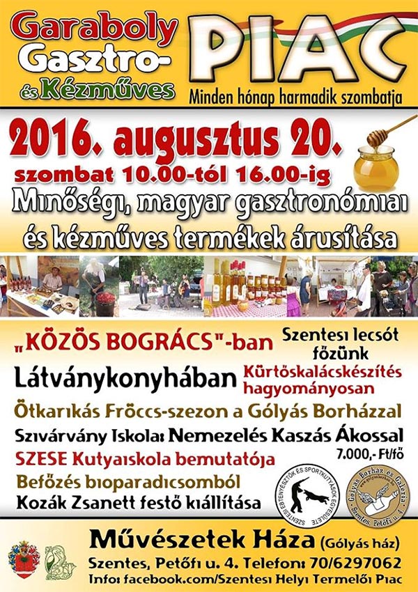 2016. augusztus 20-án az Ünnepi Piacon lehetőségük lesz a jól ismert kiváló minőségű magyar élelmiszereket kóstolni, a termelőkkel beszélgetni és tőlük vásárolni. Végigkövethetik a "Helóta biokertből" származó, garantáltan bio alapanyagból, tartósítószermentes paradicsom ivólé befőzését, a termelő, Szabó Csaba prezentálásában A nemezelés mesterfogásait egy autentikus művésztől, Kaszás Aba Ákostól tanulhatják. A finomságok sorából nem maradhat el a faszénen készülő kürtőskalács, amit mindenki kedve szerint saját kezűleg elkészíthet. És még sok-sok kulturális és élményprogram!!! Bízunk abban, hogy minél többen töltik meg szabad idejüket a Piac élményeivel, garabolyukat a Piac finomságaival! Szeretettel várnak minden kedves érdeklődő szentesit és Szentesre látogató embert!