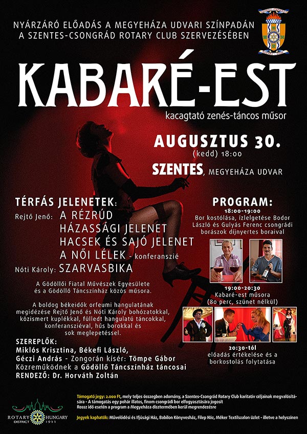 A Szentes-Csongrád Rotary Club szervezésében KABARÉ-EST-tel zárja kapuját a Nyári Szabadtéri Színház.