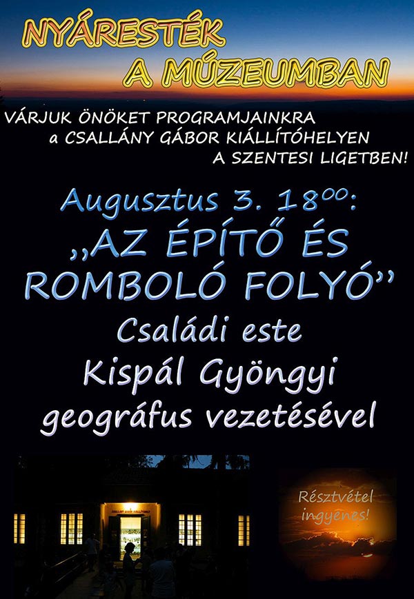 Szeretettel várunk mindenkit a jövő héten, 2016. augusztus 3-án 18.00 órától a Csallány Gábor Kiállítóhelyen, ahol Kispál Gyöngyi geográfus tart kísérletezéssel, bemutatóval egybekötött előadást a víz romboló erejéről "AZ ÉPÍTŐ ÉS ROMBOLÓ FOLYÓ" címmel.