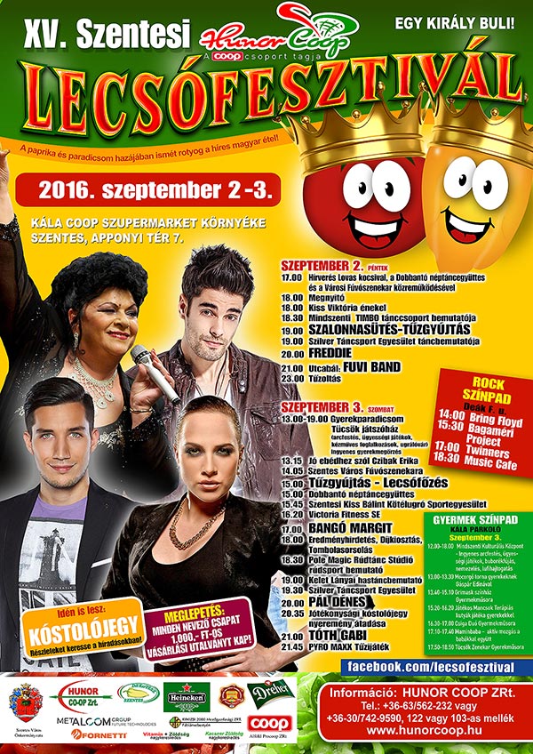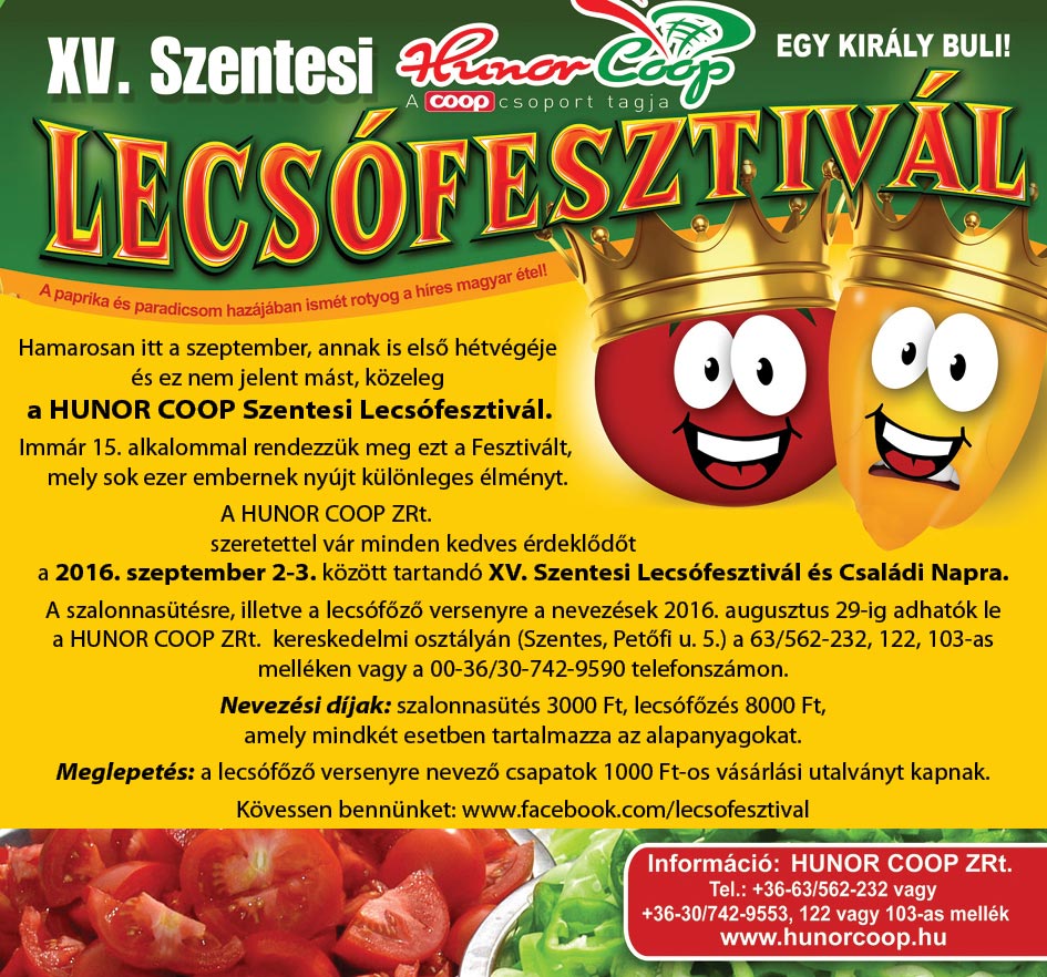 Hamarosan itt a szeptember, annak is első hétvégéje és ez nem jelent mást, közeleg a HUNOR COOP Szentesi Lecsófesztivál. Immár 15. alkalommal rendezzük meg ezt a Fesztivált, mely sok ezer embernek nyújt különleges élményt. A HUNOR COOP ZRt. szeretettel vár minden kedves érdeklődőt a 2016. szeptember 2-3. között tartandó XV. Szentesi Lecsófesztivál és Családi Napra.