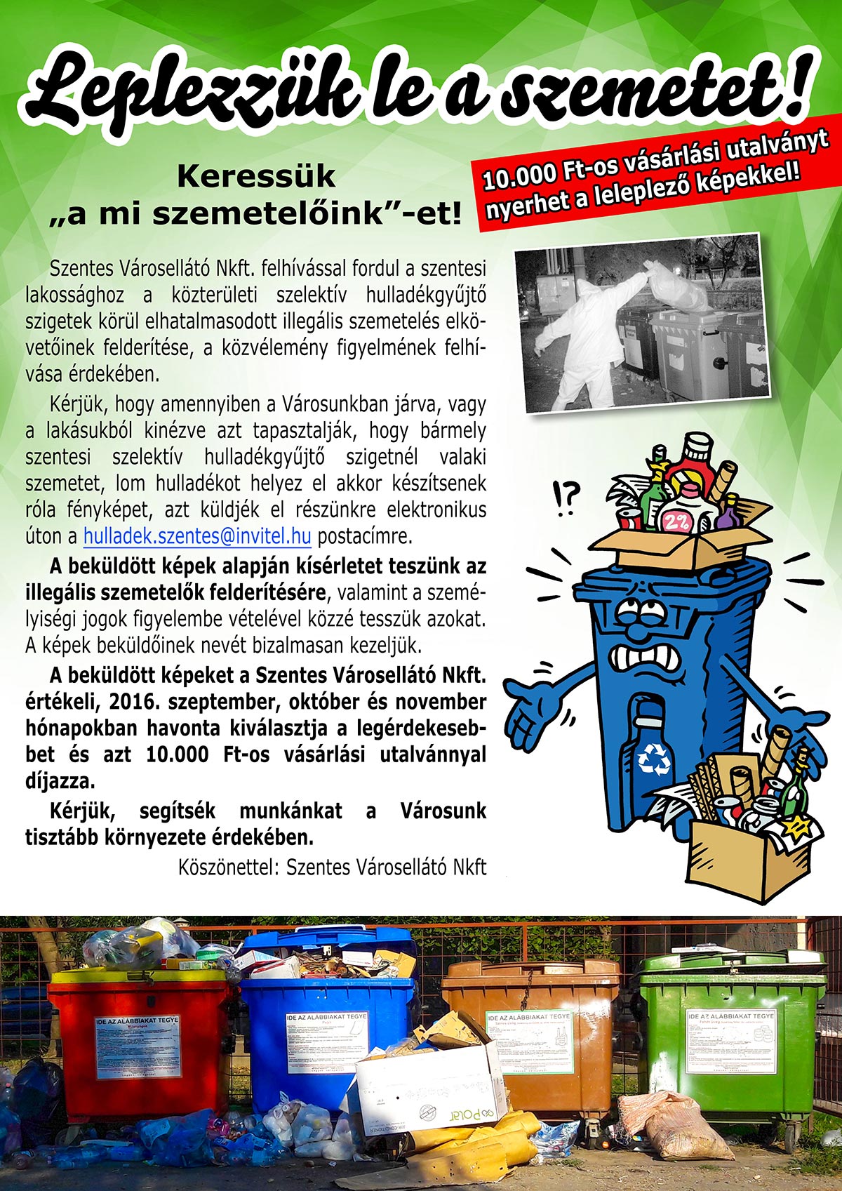 Kérjük, hogy amennyiben a Városunkban járva, vagy a lakásukból kinézve azt tapasztalják, hogy bármely szentesi szelektív hulladékgyűjtő szigetnél valaki szemetet, lom hulladékot helyez el akkor készítsenek róla fényképet, azt küldjék el részünkre elektronikus úton a hulladek.szentes@invitel.hu postacímre.