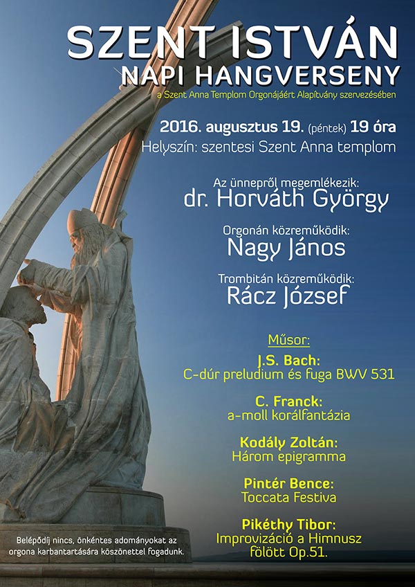 Szent István napi hangverseny rendezett a Szent Anna Templom Orgonájáért Alapítvány 2016. augusztus 19-én pénteken. Nagy János orgona- és Rácz József trombitajátékára sokan voltak kíváncsiak, akiknek az ünnep fontosságáról dr. Horváth György osztotta meg gondolatait.