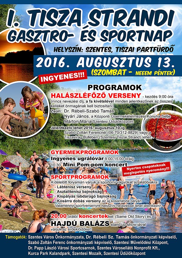 2016. augusztus 13-án rendezik meg hagyományteremtő céllal az első Tisza Strandi Gasztro- és Sportnapot a szentesi tiszai partfürdőn.