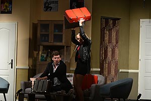 De, lássuk mi történt a színpadon: A fordulatos, pergő komédia egy bőröndcserével indul, amikor is az Elvis-rajongó Tom és felesége (Alice) Miami-ba készül a várva várt Elvis-gyűlésre, de a nagy köd miatt törlik járatukat. Csalódottan hazatérnek, majd otthon veszik észre, hogy egy „szerencsés” csere folytán fél millió dollár kerül a birtokukba, amikor is véletlenül más bőröndjét hozták el a reptérről. További bonyodalmakat okoz Tom pofátlanul jóképű testvére, Barney érkezése. Tervei szerint aznap este, bátyja lakásában szeretné meghódítani legújabb trófeáját, Murielt. Barney reményei azonban szertefoszlanak, amikor Tomékat otthon találja. Váratlanul betoppan Alice nagynénje is 20 ezer dollárral a táskájában, amit nászajándékba szán Alice-nak és Tomnak. A kalamajka itt még nem ért véget, hiszen „csatlakozik a társasághoz” Frankie, a bandita, aki az elcserélt táska tulajdonosának dolgozik, és akit mindenki rendőrnek gondol. Hendy felügyelő megjelenésével megoldódni látszik a helyzet, csak közben kiderül, hogy a fél millió dollár hamis! Ettől megint minden összekuszálódik!