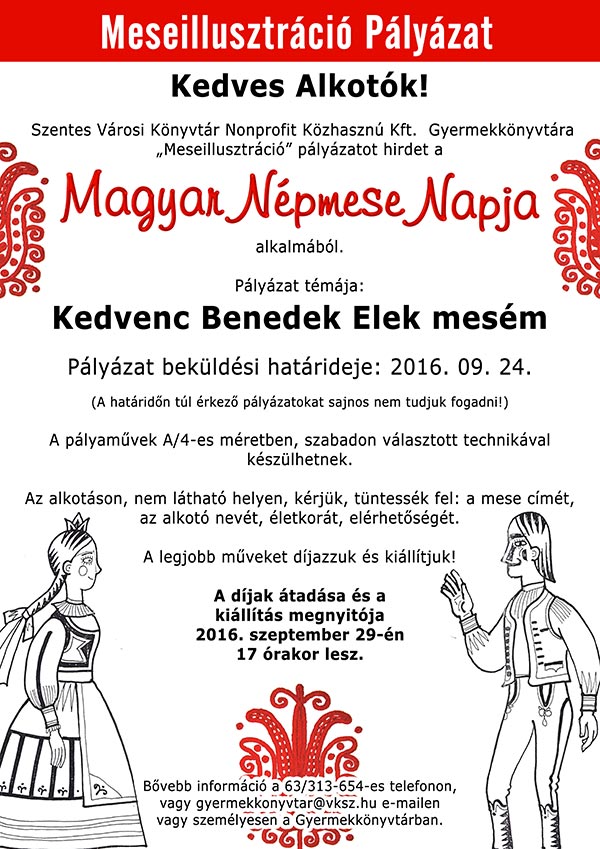 “Magyar Népmese Napja” a Szentes Városi Könyvtár Nonprofit Közhasznú Kft. Gyermekkönyvtárában 2016. szeptember 29-én Az idén 12. alkalommal kerül megrendezésre a Gyermekkönyvtárban a Népmese napja. Szeretettel hívunk és várunk minden meseszerető gyereket, aki elhozza és felovassa kedvenc meséjét. Szeretnénk ebben az évben is méltóképpen megemlékezni nagy mesemondónk Benedek Elek születésnapjáról. A bemutatni kívánt mű magyar népmese legyen! Bővebb információ és regisztráció a 63/313-654-es telefonon, vagy gyermekkonyvtar@vksz.hu e-mailen, vagy személyesen a Gyermekkönyvtárban.