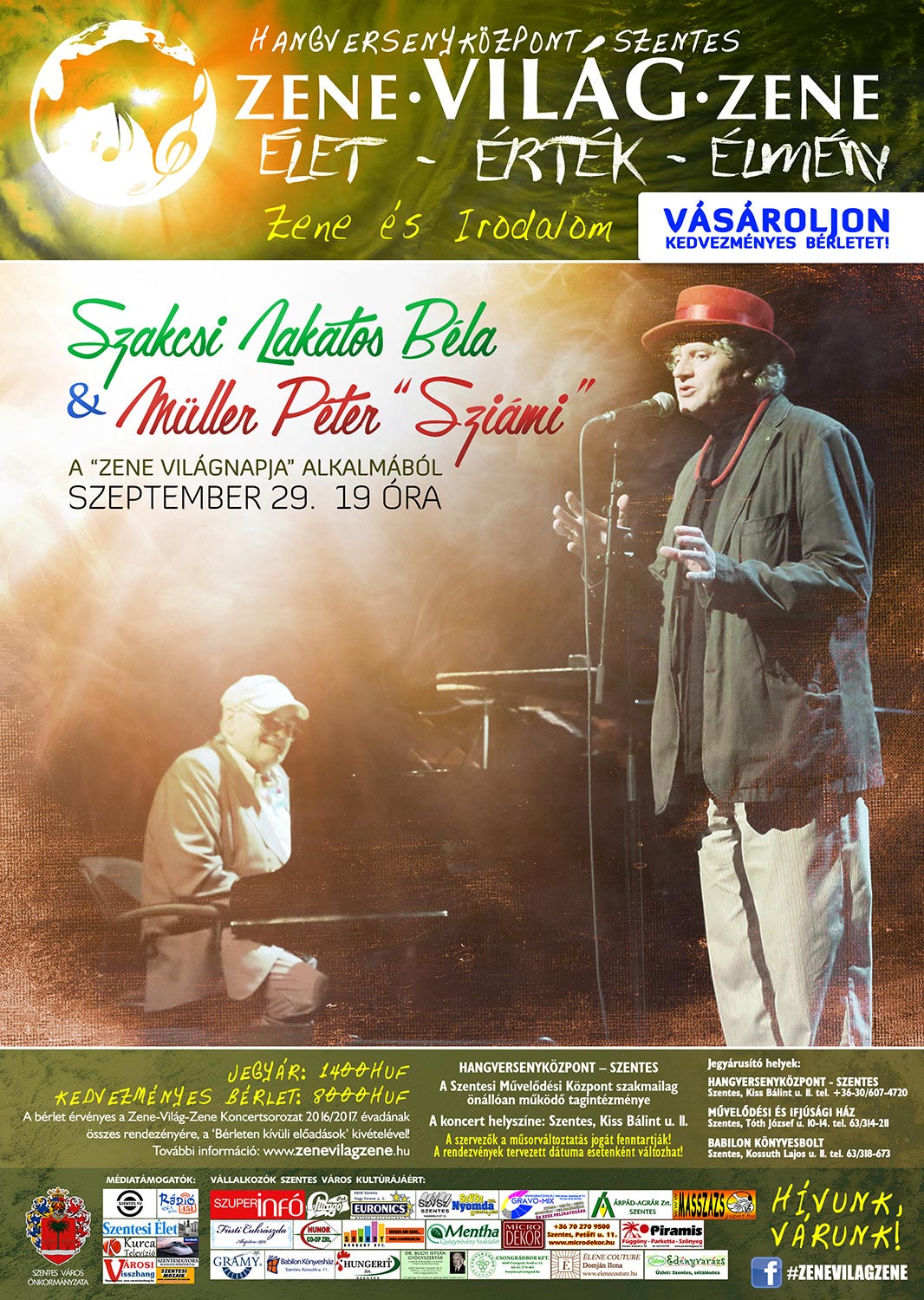 Zene-Világ-Zene - Zene és Irodalom A "Zene Világnapja" alkalmából 2016. szeptember 29. (csütörtök) 19 órai kezdettel Szakcsi Lakatos Béla és Müller Péter "Sziámi" lesz a vendég a Hangversenyközpontban.