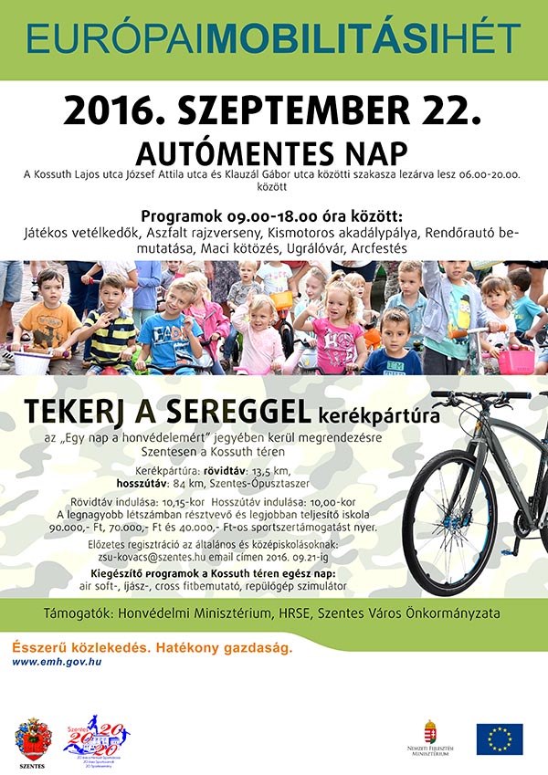 Az Európai Mobilitás Hét keretében rendezik meg az Autómentes Napot Szentesen, amikor is 2016. szeptember 22-én reggel 6 órától 20 óráig a Kossuth Lajos utca József Attila utca és Klauzál Gábor utca közötti szakasza lezárásra kerül teljes szélességében. A Mobilitás Hét keretében számos programon vehetünk részt a lezárt útszakaszon. További információk a plakáton! Ezen a napon kerül megrendezésre a „Tekerj a sereggel”a Honvédelmi Minisztérium országos rendezvénye, melyben idén a 37.II.Rákóczi Ferenc Műszaki Ezred is érintett. A rendezvény kapcsán szeretnék felhívni a figyelmet a Magyar Honvédség tevékenységére, ezen belül a 37.II.Rákóczi Ferenc Műszaki Ezred munkájára. Toborzás is szerepel a programok között.