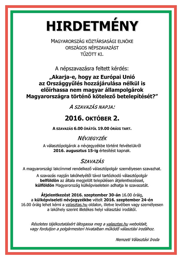 Magyarország köztársasági elnöke országos népszavazást tűzött ki 2016. október 2-ára. A népszavazásra feltett kérdés: ,,Akarja-e, hogy az Európai Unió az Országgyűlés hozzájárulása nélkül is előírhassa nem magyar állampolgárok Magyarországra történő kötelező betelepítését?" A szavazás napján reggel 6 órától este 19 óráig lehet szavazni abban a szavazókörben, amelyben a választó szerepel a névjegyzékben. A szavazóköri névjegyzékbe történő felvételről a választók 2016. augusztus 16-ig tájékoztatást kaptak a Nemzeti Választási Irodától.