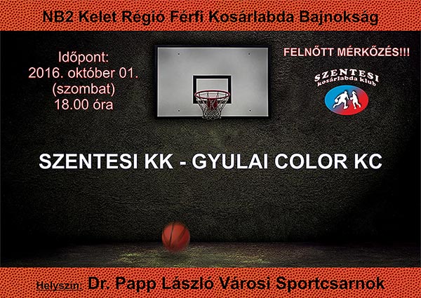 A Szentesi Kosárlabda Klub férfi NB2 bajnokság nyitó mérkőzésén szurkolhatunk 2016. október 1-jén a Dr. Papp László Városi Sportcsarnokban.