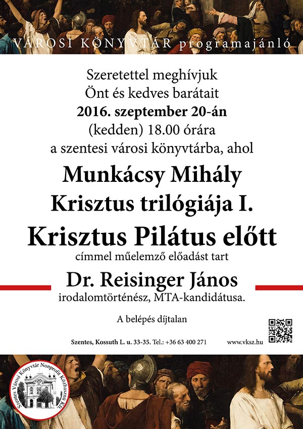 Szeretettel meghívjuk Önt és kedves barátait 2016. szeptember 20-án (kedden) 18.00 órára a szentesi városi könyvtárba, ahol Munkácsy Mihály Krisztus trilógiája I. Krisztus Pilátus előtt címmel műelemző előadást tart Dr. Reisinger János irodalomtörténész, MTA-kandidátusa. A belépés díjtalan!