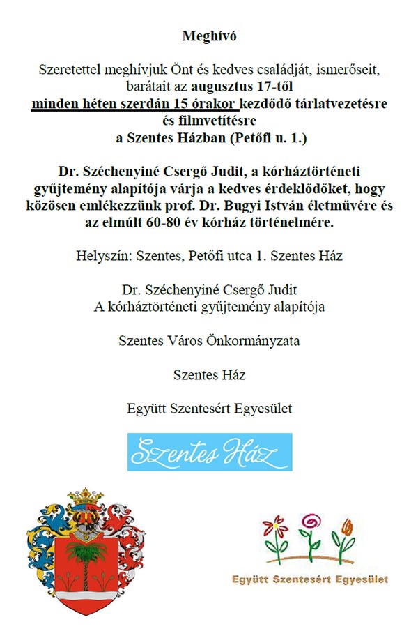 Szeretettel meghívjuk Önt és kedves családját, ismerőseit, barátait minden héten szerdán 15 órakor kezdődő tárlatvezetésre és filmvetítésre a Szentes Házban (Petőfi u. 1.) Dr. Széchenyiné Csergő Judit, a kórháztörténeti gyűjtemény alapítója várja a kedves érdeklődőket, hogy közösen emlékezzünk prof. Dr. Bugyi István életművére és az elmúlt 60-80 év kórház történelmére.