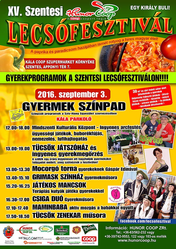 2016. szeptember 2-án elkezdődött az év legnagyobb szentesi gasztronómiai fesztiválja. Immáron 15. éve rendezi meg a HUNOR COOP ZRt. a fóliák országában a Lecsófesztivált. Tizenegypár bográcsból indult és mára 270 kondérban fő a szentesi lecsó. És, hogy mi a titka a rendezvénynek? Talán az, hogy ezen a két napon a résztvevők egy igaz nagy családnak érzik magukat.