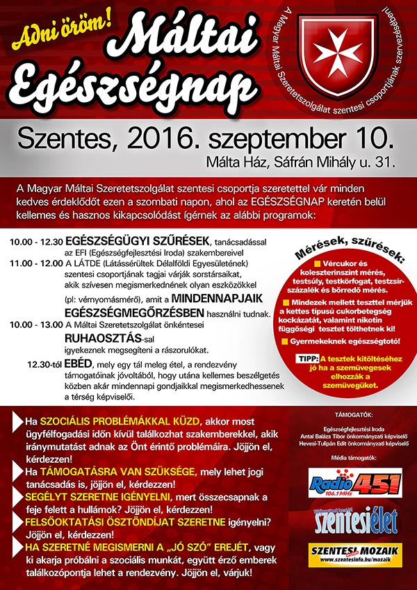 A Magyar Máltai Szeretetszolgálat Szentesi Csoportja egészségnapot szervezett szeptember 10-én, a Sáfrán Mihály utcai Málta Házban. A ruhaosztáson túl, az egészség jegyében töltöttek el az érdeklődők egy kellemes napot, ahol a szervezők babgulyást kínáltak ebédre.