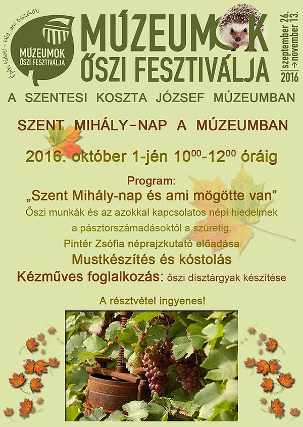 Mindenkit szeretettel várunk jövő hét végén, a 2016. október 1-jén 10-12 óra között megrendezésre kerülő Múzeumok Őszi Fesztiválja első eseményére, melynek témája a Szent Mihály-nap hagyományai. E témában Pintér Zsófia néprajzkutató tart előadást, majd mustkészítés és kézműves foglalkozás várja a látogatókat.