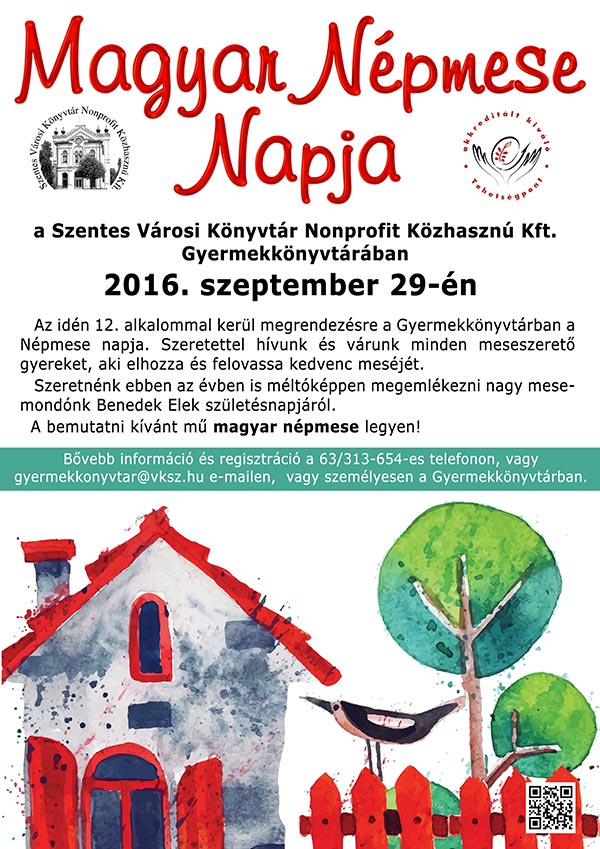“Magyar Népmese Napja” a Szentes Városi Könyvtár Nonprofit Közhasznú Kft. Gyermekkönyvtárában 2016. szeptember 29-én Az idén 12. alkalommal kerül megrendezésre a Gyermekkönyvtárban a Népmese napja. Szeretettel hívunk és várunk minden meseszerető gyereket, aki elhozza és felovassa kedvenc meséjét.