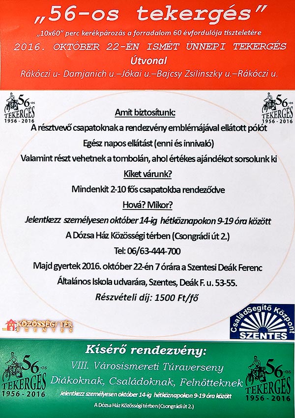 2016. október 22-én az 56-os forradalom 60. évfordulója tiszteletére 10x60 perces "56-os tekergést" szervez a Családsegítő Központ diákoknak, felnőtteknek, családoknak. A programhoz kapcsolódva a Közösségi tér megrendezi a VIII. Városismereti túraversenyét. További részletek a plakáton!