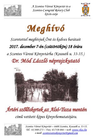 Ártéri szőlőskertek az Alsó-Tisza mentén Dr. Mód László néprajzkutató előadása a könyvtárban A Szentes Városi Könyvtár és a Szentes-Csongrád Rotary Club szeretettel meghívja Önt és kedves barátait a könyvtárba, ahol 2017. december 7-én csütörtökön 18 órakor dr. Mód László néprajzkutató, a Szegedi Tudományegyetem oktatója Ártéri szőlőskertek az Alsó-Tisza mentén című vetített képes könyvbemutatóját rendezik meg.