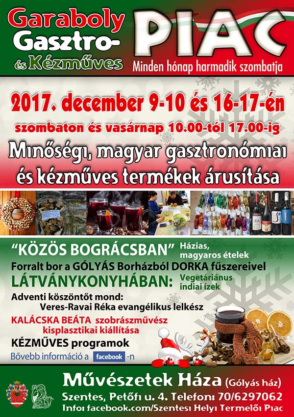 Gasztro- és Kézműves Piac A Szivárvány Művészeti Alapítvány már 12. éve, a Művészetek Háza megnyitása óta szervezi egyre népszerűbb adventi gasztro-kulturális programsorozatát. A minőségi magyar gasztronómiát, helyi termelői élelmiszereket, egyedi kézműves termékeket és számtalan kulturális programot tartalmazó esemény 4. éve a Gasztro- és Kézműves Piac keretei között zajlik. Az idén kiemelkedő programelem 09-én (szombaton) 11.00 órakor Veres-Ravai Réka evangélikus lelkész asszony ünnepi köszöntője, 10-én (vasárnap) 10.00-15.00 óráig Debreceni-Kis Helga a "Fölszállott a páva - 2017" népzenei tehetségkutató verseny döntősének csodálatos ünnepre hangoló muzsikálása. Különleges művészi élményben lesz részük, azoknak a látogatóinknak, akik megnézik Kalácska Beáta szobrászművész-tanár kiállítását. Újdonság, hogy 10-én és 16-17-én a szegedi Őrangyal Gasztroház - és Étterem autentikus vegetáriánus ételeket készít a Látványkonyhánkban.