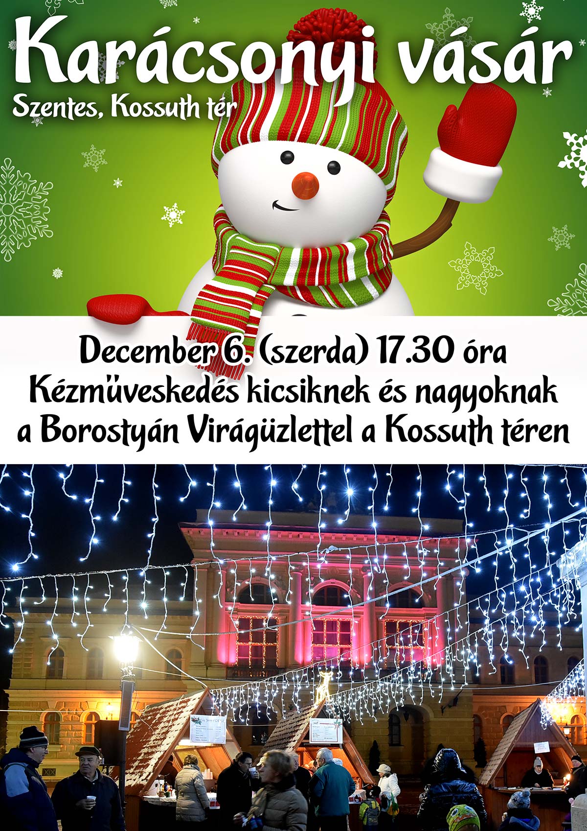 Kézműveskedés a Karácsonyi Vásárban December 6-án (szerda) 17.30 óra Kézműveskedés kicsiknek és nagyoknak a Borostyán Virágüzlettel a Kossuth téren. Gyere el és csodáljuk meg a tér díszkivilágítását!