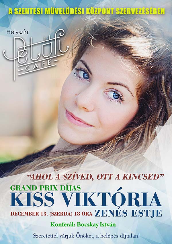 Kiss Viktória zenés estje A Szentesi Művelődési Központ szervezésében Kiss Viktória Grand Prix díjas énekes zenés estjére kerül sor a Szecessziós Házban található Petőfi Cafe-ban. A belépés díjtalan!