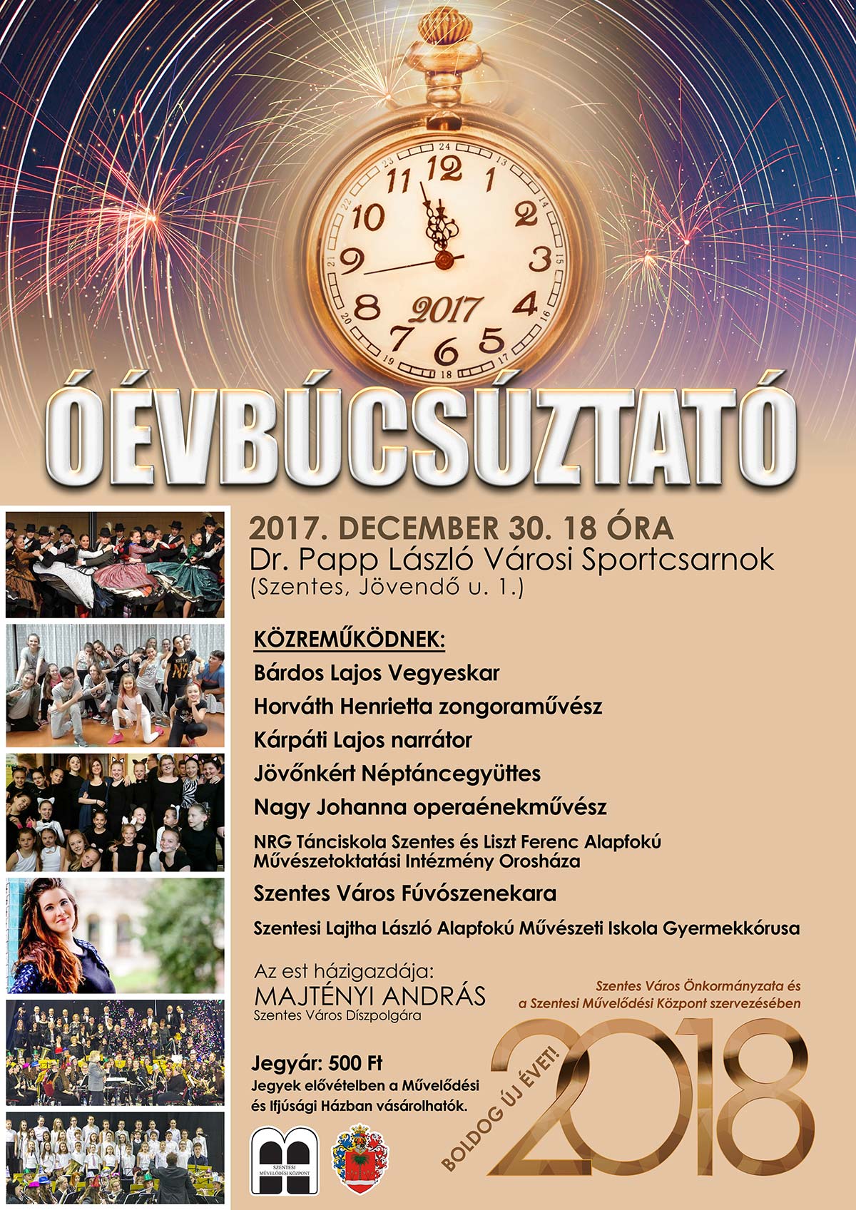 Óévbúcsúztató ünnepi koncert 2017. december 30-án 18 órai kezdettel rendezik meg a hagyományos Óévbúcsúztató Ünnepi Koncertet a városi sportcsarnokban! Jegyek elővételben 500 Ft-os egységes áron kaphatók! Bővebb infó a plakáton!