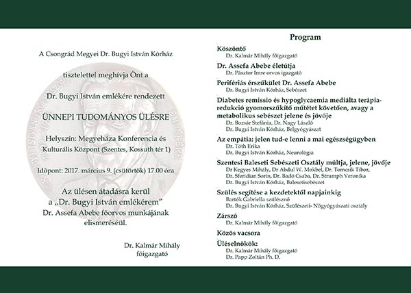 A Csongrád Megyei Dr. Bugyi István Kórház és a Dr. Bugyi István Kórházért Alapítvány tisztelettel meghívja Önt a Prof. Dr. Bugyi István emlékére rendezett ÜNNEPI TUDOMÁNYOS ÜLÉSRE. Helyszín: Megyeháza Konferencia és Kulturális Központ Időpont: 2017. március 9. (csütörtök) 17 óra