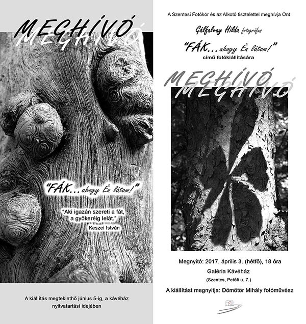 A Szentesi Fotókör tisztelettel meghívja Önöket 2017. április 3-án, hétfőn 18.00 órára GÁLFALVAY HILDA szentesi fotográfus „FÁK… AHOGY ÉN LÁTOM!” című fotókiállítására Szentesen a Galéria Kávéház és Étterembe (Szentes Petőfi u. 7.)