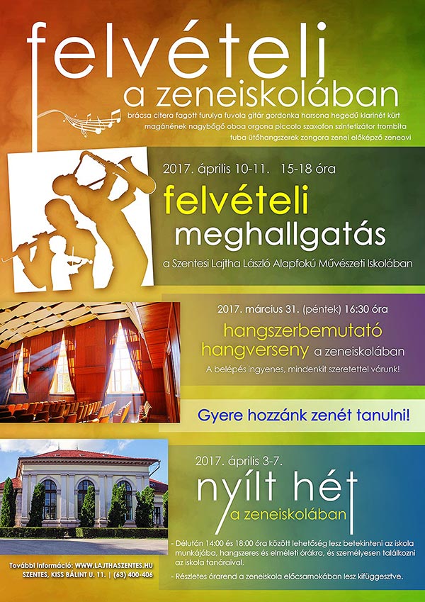 Felvételi meghallgatás: 2017. április 10-11. (hétfő, kedd) 15-18 óra Hangszerbemutató hangverseny: 2017. mácius 31. (péntek) 16:30 óra Nyílt hét: 2017. április 3-7. 14-18 óra