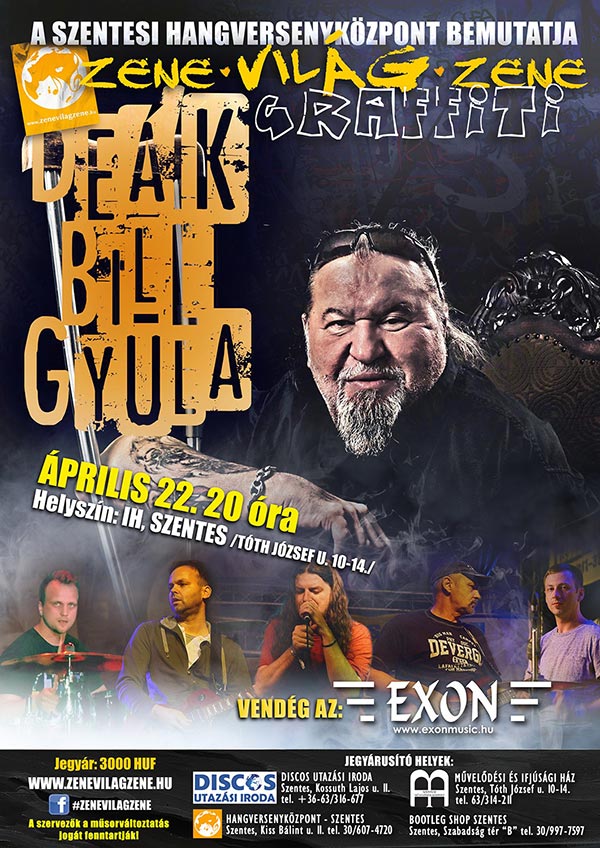 A SZENTESI HANGVERSENYKÖZPONT BEMUTATJA Zene-Világ-Zene Graffiti 2017. április 22. (szombat) 20 óra: Deák Bill Gyula Vendég az EXON SPOT: https://www.youtube.com/watch?v=mglRggKQ2iA Helyszín: Művelődési és Ifjúsági Ház Szentes, Tóth J. u. 10-14.