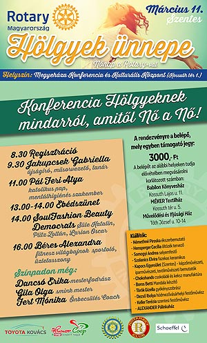Hölgyek ünnepe címmel, egy programokban igen gazdag eseményt rendez a Szentes- Csongrád Rotary Club március 11-én a Megyeháza Konferencia és Kulturális Központban. A rendezvény támogatói jeggyel látogatható és a bevételt jótékony célra fordítják. Nagypéter Sándor, a Szentes- Csongrád Rotary Club soros elnöke elmondta, a magyarországi klubok között az övékben van a legtöbb nő, a tagságnak majdnem a fele. Hozzátette, a márciusi rendezvény nemcsak a hölgyeknek szól, hiszen a párjukkal együtt vehetnek részt az ünnepen. Az idén nyártól a Rotary Club magyarországi kormányzója posztot betöltő Mészáros Zoltán úgy fogalmazott, azt szeretnénk, amit helyben, a Szentes-Csongrád Rotary Clubbal mutatnak, országosan is jellemző legyen. A legfontosabb, hogy a hölgyekről szól, nekik rendezzük ezt a programot. A Hölgyek ünnepével példát szeretnénk mutatni. A program háziasszonya Jakupcsek Gabriella újságíró lesz. Róla is sok mindent megtudhatnak majd a jelenlévők, többek között munkásságáról és legutóbbi könyvéről is hallhatnak. Pál Feri atya, mentálhigiénés szakember személyében egy kiváló előadó is gyarapítja a fellépők sorát. A Soul Fashion Beauty öltözködéssel, divattal és stílussal, Fert Mónika önbecsülés coach életvezetéssel kapcsolatban ad tanácsokat az ünnepelteknek. A résztvevők emellett Béres Alexandra fitneszvilágbajnokkal is találkozhatnak. Kiemelt szempont volt az is, hogy a helyi női hírességek is képviselhessék magukat. Meghívást kapott Gila Olga sminkmester és Dancsó Erika mesterfodrász is, akik szakmájuk kiválóságai. Az egész napos program délelőtt fél 10-kor kezdődik, és a konferencia terem mellett a vörös és zöld teremben is érdekességekkel várja a látogatókat.