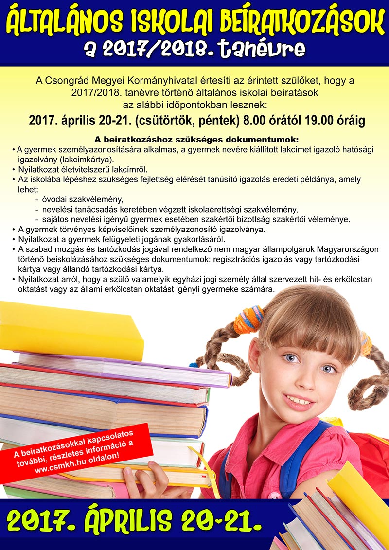 Tájékoztatjuk a Tisztelt Szülőket, hogy a 2017/2018. tanévre a 2017. május 31-ig hatodik életévet és az iskolába lépéshez szükséges fejlettséget elérő gyermeküket 2017. április 20-21-én 08.00 és 19.00 óra között írathatják be a lakóhely szerinti kötelező felvételt biztosító vagy a választott általános iskola első évfolyamára. További részletek a plakáton, mely kinagyítható!