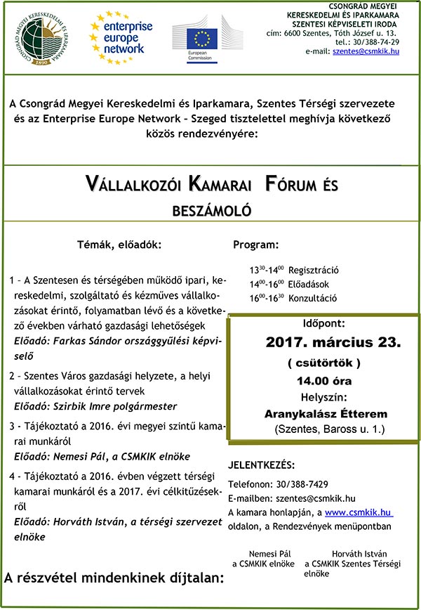 2017. március 23-án a Csongrád Megyei Kereskedelmi és Iparkamara, Szentes Térségi szervezete és az Enterprise Europe Network – Szeged tisztelettel meghívja következő közös rendezvényére. További részletek a plakáton!