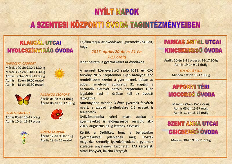 Nyílt napokkal várják a leendő óvodásokat a Szentesi Központi Óvodai Körzet óvodáiban, melyekről az alábbi plakátokról tájékozódhat.