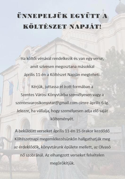 Ha költői vénával rendelkezik és van egy verse, amit szívesen megosztana másokkal április 11-én a Költészet Napján megteheti. Kérjük, juttassa el írott formában a Szentes Városi Könyvtárba személyesen vagy a szentesvarosikonyvtar@gmail.com címre április 6-ig. Jelezze, ha vállalja, hogy személyesen adja elő saját költeményét. A beküldött verseket április 11-én 15 órakor kezdődő Költészetnapi megemlékezésünkön hallgathatják meg az érdeklődők, könyvtárunk épülete mellett, az Olvasó nő szobránál. Az elhangzott verseket felvételen megörökítjük.