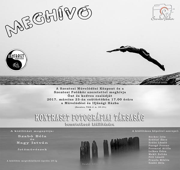 A Szentesi Művelődési Központ és a Szentesi Fotókör szeretettel meghívja Önt és kedves családját 2017. március 23-án, csütörtökön 17.00 órára a Művelődési és Ifjúsági Házba (Szentes, Tóth J. u. 10-14.) a KONTRASZT FOTOGRÁFIAI TÁRSASÁG bemutatkozó kiállítására