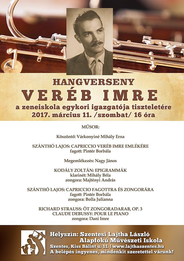 A Lajtha László Alapfokú Művészeti Iskolában Veréb Imrére egykori igazgatóra emlékeztek 2017. március 11-én. A hangverseny elején Várkonyi Mihály Erna, az intézmény vezetője köszöntötte az igazgató családját. Szánthó Lajos: Capricció művével kezdődött a koncert, melyet Pintér Borbála adott elő. Különlegessége a műnek, hogy Szántó Lajos Veréb Imre rokonságába tartozik. Nagy János a zeneiskola egykori címzetes igazgatója Veréb Imre életútját ismertette aki elég fiatalon 46 éves korában halt meg. A szentesi hangversenyélet elindítója a zeneoktatás maghatározó alakja lett munkássága alatt. Az emlékhangversenyen fellépett még Mihály Béla (klarinét) és Majtényi András (zongora), valamint Pintér Borbála (fagott) és Bolla Julianna (zongora) és Dani Imre (zongora). KATT a képre!