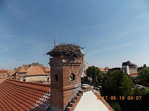 Fennakadt egy nagyobb fóliadarab a Gólyás-ház kéményén található gólyafészek ágain. A négy négyzetméteres műanyag az ott fészkelő madárpárt és leendő kicsinyeit veszélyeztethette, mert könnyen beleakadhatnak a fóliába, amely a madarak sérüléséhez vezethet. A mentéshez a szentesi tűzoltók segítségét kérték. Az egységek gépezetes tolólétra segítségével jutottak fel a több méteres magasságban található fészekhez, amelyben több tojás is volt. Rövid idő alatt eltávolították a fóliadarabot, így a gólyák biztonságban várhatják a fiókák érkezését.