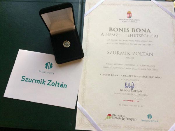 Az Emberi Erőforrás Minisztériuma a Nemzeti Tehetség Program keretében Szurmik Zoltán a szentesi Horváth Mihály Gimnázium tanára részére kiemelkedően eredményes és áldozatos tehetséggondozó munkája elismeréseképpen a "BONIS BONA - A Nemzet Tehetségeiért" díjat adományozott, melyet 2017. június 16-án vehetett át a Magyar Tudományos Akadémián.