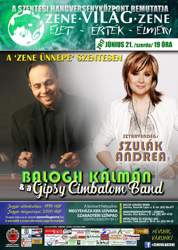 A SZENTESI HANGVERSENYKÖZPONT BEMUTATJA Zene-Világ-Zene | Élet - Érték - Élmény | A "Zene Ünnepe" Szentesen 2017. június 21. (szerda) 19 óra: Balogh Kálmán és a Gipsy Cimbalom Band - Sztárvendég: Szulák Andrea Spot: https://www.youtube.com/watch?v=n5NJjRERpK8 Helyszín: Megyeháza KKK szabadtéri színpad (Szentes, Kossuth tér 1.)