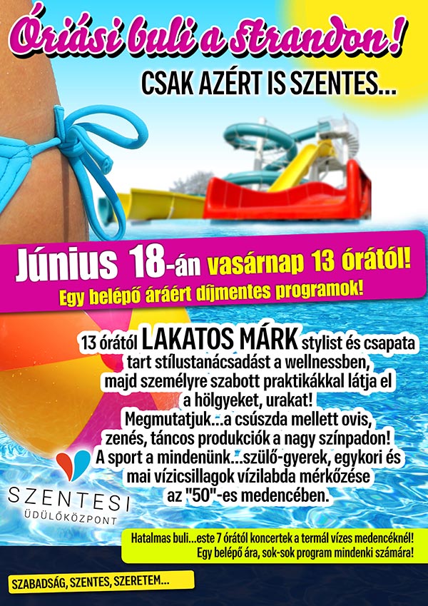 2017. június 18-án vasárnap már reggeltől várnak mindenkit a szentesi strandra a Dr. Rébeli-Szabó József Városi Uszodában, ahol nyárindító party-t rendeznek. Délelőtt is lehet a fakultatív programokon részt venni, de az igaz banzáj 13 órától indul! LAKATOS MÁRK stylist és csapata tart stílustanácsadást a wellnessben, majd személyre szabott praktikákkal látja el a hölgyeket, urakat! A csúszda mellett ovis, zenés, táncos produkciók a nagy színpadon, valamint sportprogram keretében szülő-gyerek, egykori és mai vízicsillagok vízilabda mérkőzése lesz az 50-es medencében. 18.00 órától koncertekkel zárul a nap!