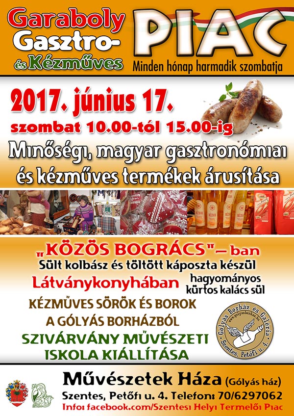 Frissen szedett meggy, málna, piszke (egres, köszméte) Bartha Edit szentesi termelőnk gyümölcsöséből, minőségi zöldségek a Bartha János Szakképző Iskola tankertjéből, házias lekvárok, szörpök, sajtok igazi kecsketejből és számos kulináris meglepetés szombati (június 17-i) piacunkon. Nagy örömünkre új termelőt is köszönthetünk: Danyiné Hajdú Katalint, aki gyógynövényes mézekkel várja a piacra érkezőket. Kézműves szépségek, ásványok és ásványból készült ékszerek továbbra is nagy választékban!