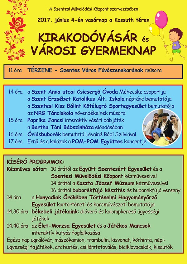 A Kossuth téren június első vasárnapján hagyományosan kirakodóvásár várja a közönséget, párosulva a városi gyereknappal. A művelődési központ népszerű rendezvénye több mint három évtizedes (37.) múltra tekint vissza, amit mindig nagyon vár kereskedő és vevő, felnőtt és gyerek egyaránt. Reméljük az időjárás is kegyeibe fogadja a kavalkád résztvevőit. Az ország minden részéből érkezett árusok sátraiban a portékák széles arzenálját találhatja majd meg a nézelődő. Bár a modern termékek is mindinkább helyet követelnek a kínálatban, a "népi" jelzőnek azért mindig létjogosultsága van az ilyen rendezvényeken.