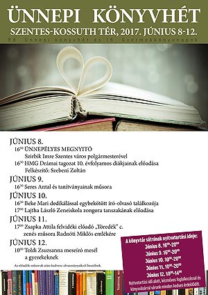 Idén 88. alkalommal kerül megrendezésre az Ünnepi Könyvhét, és ezzel összekötve a 16. Gyerekkönyvnapok hazánkban 2017. június 8-12. között. Több mint 80 település kapcsolódott a központi rendezvényhez, melyek között ott van városunk. Szentesen az ÜNNEPI KÖNYVHÉT keretében nem csak a könyvtár polcain találkozhatunk majd a könyvekkel, azok íróival, hanem Szentesen a Kossuth téren is.