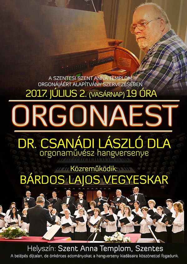 2017. július 2-án vasárnap Dr. Csanádi László orgonaművész hangversenyére várják az érdeklődőket, melyen közreműködik a Bárdos Lajos Vegyeskar.