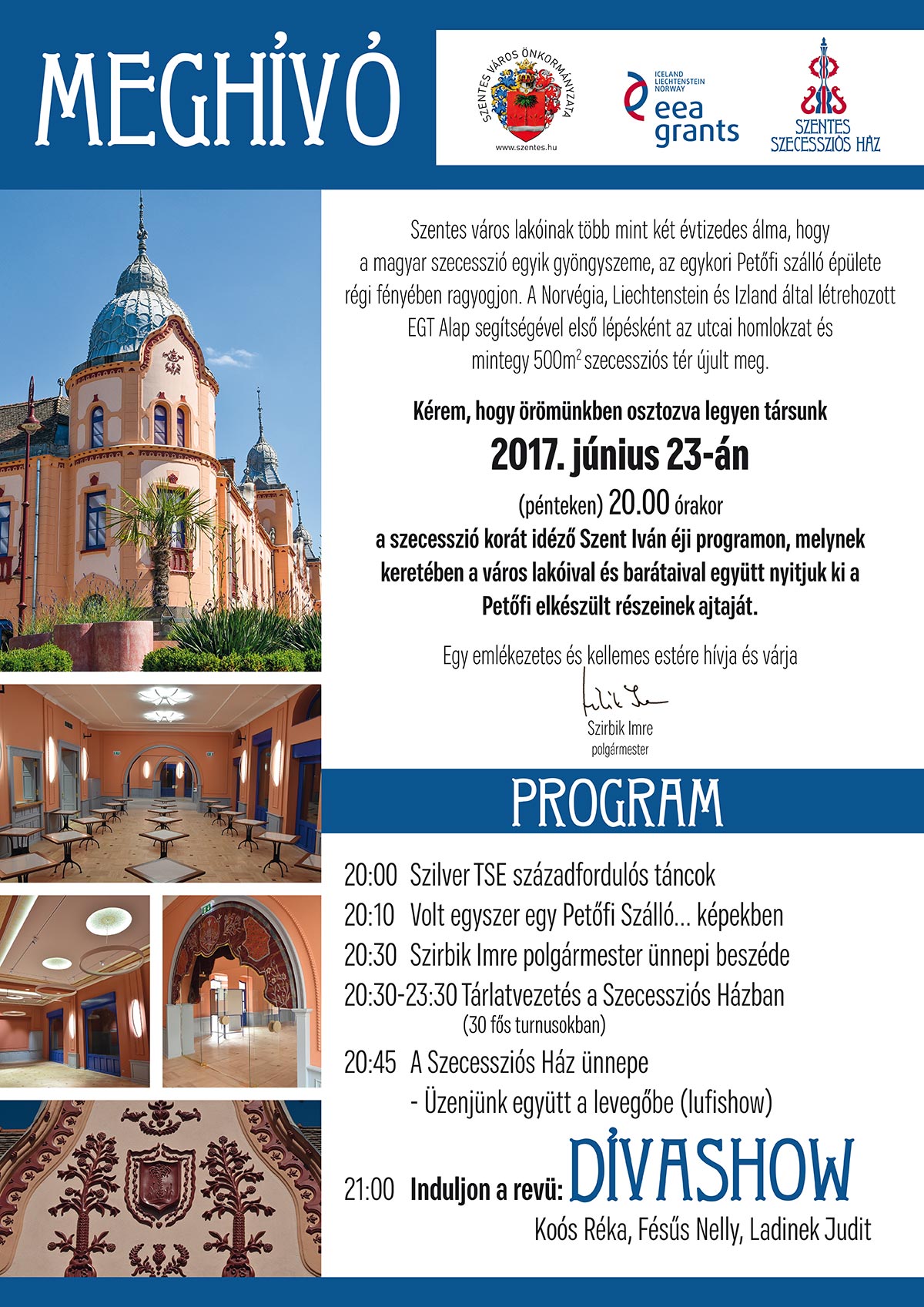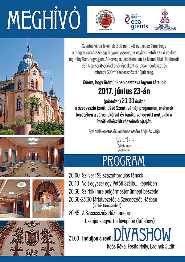 Szentes város lakóinak több mint két évtizedes álma, hogy a magyar szecesszió egyik gyöngyszeme, az egykori Petőfi szálló épülete régi fényében ragyogjon. A Norvégia, Liechtenstein és Izland által létrehozott EGT Alap segítségével első lépésként az utcai homlokzat és mintegy 500m2 szecessziós tér újult meg.