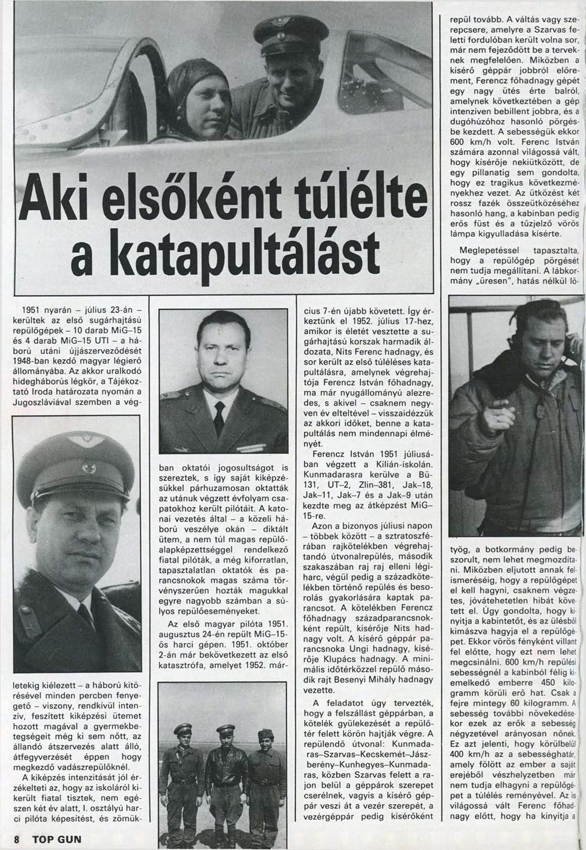 Hatvanöt évvel ezelőtt, 1952. július 17-én került sor az első túléléses katapultálásra, Szentes- Cserebökény légterében. A szervező HTBK helyi elnöke, Móra József elevenítette fel az akkori eseményeket, melyekről egészen a 90-es évekig csak amolyan városi legendaként lehetett hallani. Mig-15-ös géppel hajtotta végre a katapultálást Ferencz István főhadnagy, akinek kísérője, Nits Ferenc hadnagy a balesetben életét vesztette.