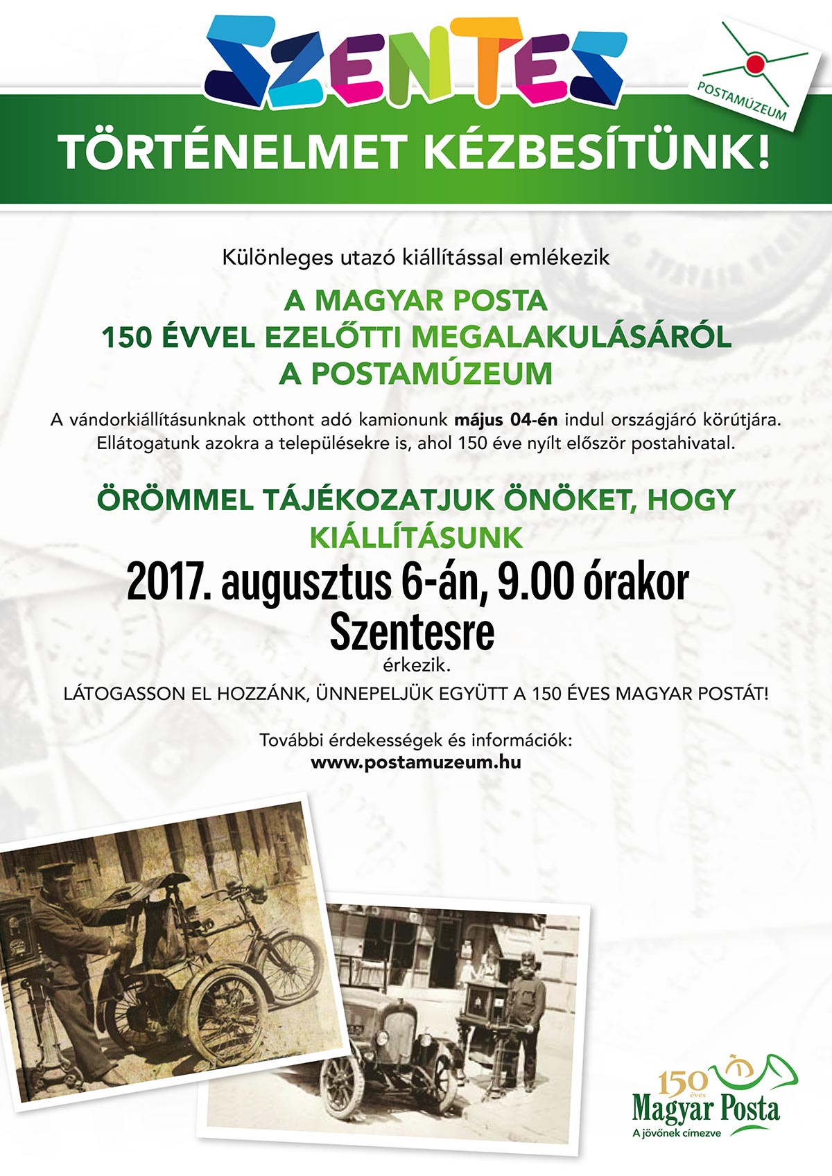 A Postakürt Alapítvány által szervezett „Történelmet kézbesítünk” elnevezést viselő kulturális kiállítás érkezik Szentesre 2017. augusztus 6-án a reggeli órákban és a kora délutáni órákban távozik.